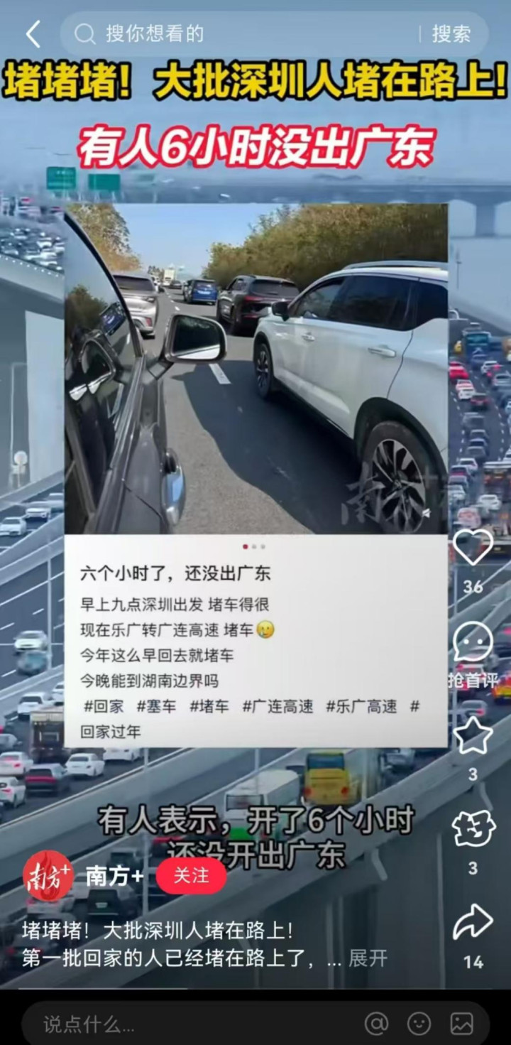 打开社交媒体,吐槽春运堵车的内容铺天盖地。一位小红书网友无奈分享:从上海出发回河南,中午(1月20日)12点就出发了,结果在苏州堵、无锡也堵,磨磨蹭蹭开了5个小时,才到常州。在“沪昆高速g60春运实况”的24小时直播里,21日晚20时40分,高速拥堵开始分流,主播告诉大家:“衢州常山西出口往江西方向,今天早上直接堵了两小时,车一动不动。”主播提醒路过的司机,要么就走国道,要么凌晨车少的时候试试。新华网也发文:“第一批回家过年的人已经堵在路上了,有网友无奈吐槽:被堵了5小时一动不动”。南方+也报道说,大批深圳人被堵在路上,有人6小时都还没出广东。